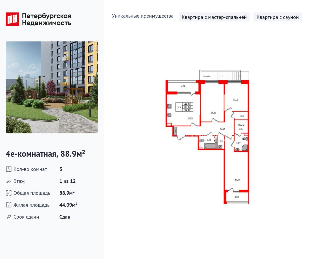 Уникальная, функциональная европланировка, большая кухня-гостиная 18.05 м², просторная прихожая 13.61 м². Общая площадь квартиры - 88.9 м², жилая 44.09 м², высота потолка 2.77 м.