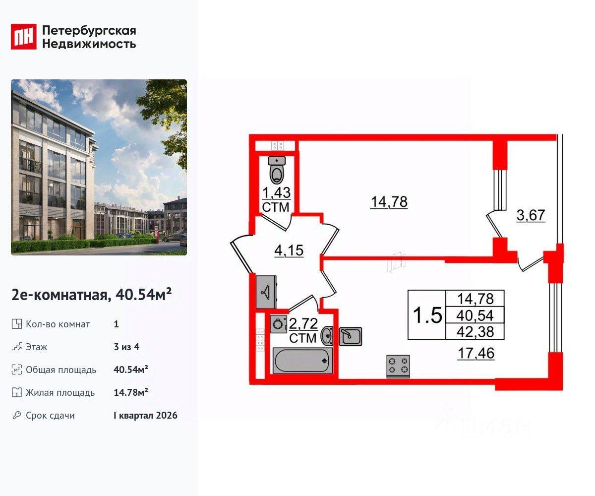 Удобная, классическая, функциональная европланировка, большая кухня-гостиная 17.46 м², просторная прихожая 4.15 м². Общая площадь квартиры - 40.54 м², жилая 14.78 м².