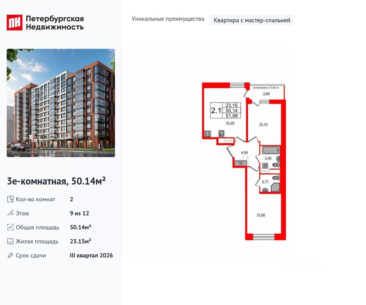Уникальная, функциональная европланировка, большая кухня-гостиная 16.29 м², вместительная прихожая 4.54 м². Общая площадь квартиры - 50.14 м², жилая 23.15 м², высота потолка 2.77 м.