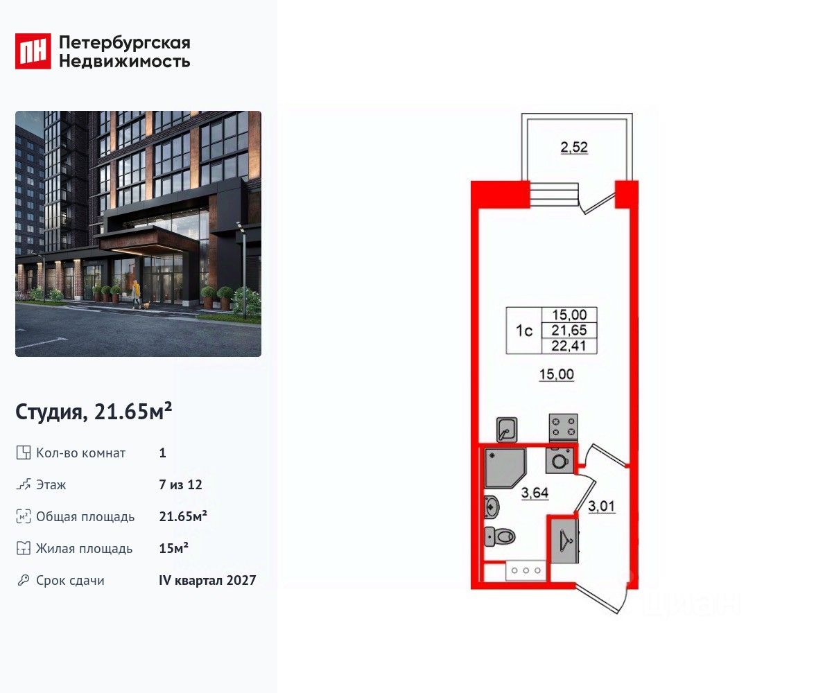 Удобная, классическая, функциональная европланировка, вместительная прихожая 3.01 м². Общая площадь студии - 21.65 м², жилая 15 м², высота потолка 2.75 м.