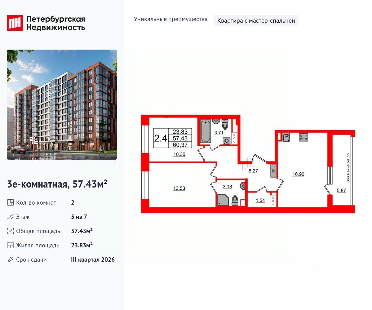 Уникальная, функциональная европланировка, большая кухня-гостиная 16.9 м², просторная прихожая 8.27 м². Общая площадь квартиры - 57.43 м², жилая 23.83 м², высота потолка 2.77 м.