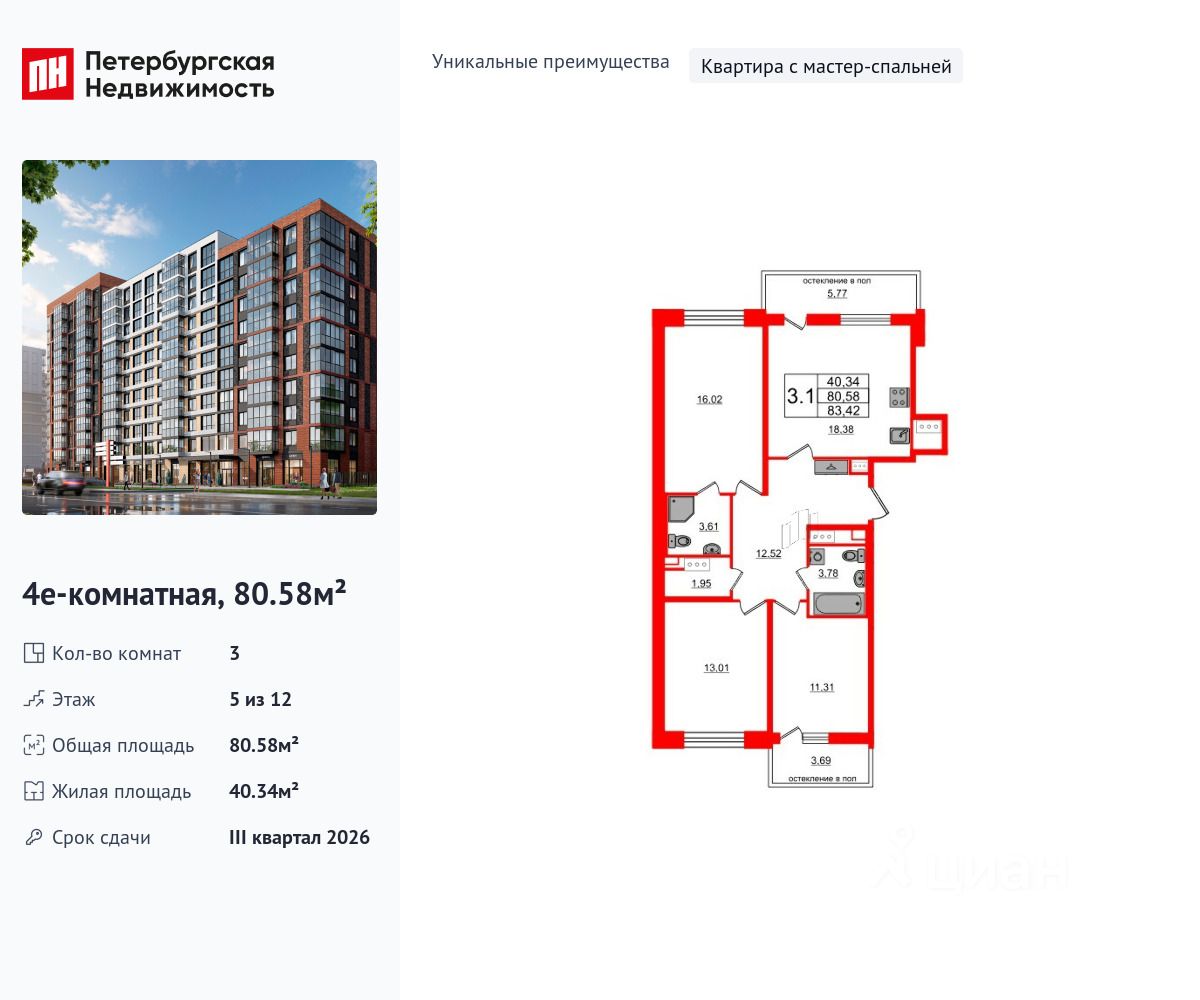 Уникальная, функциональная европланировка, большая кухня-гостиная 18.38 м², просторная прихожая 12.52 м². Общая площадь квартиры - 80.58 м², жилая 40.34 м², высота потолка 2.77 м.