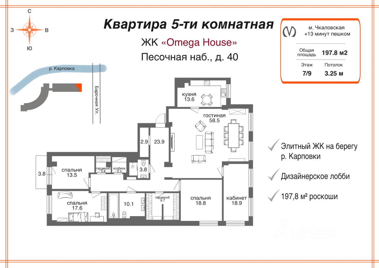 Преимущества: - Элитный ЖК на берегу р Карповки - Дизайнерское лобби - 197,8 м² Роскоши