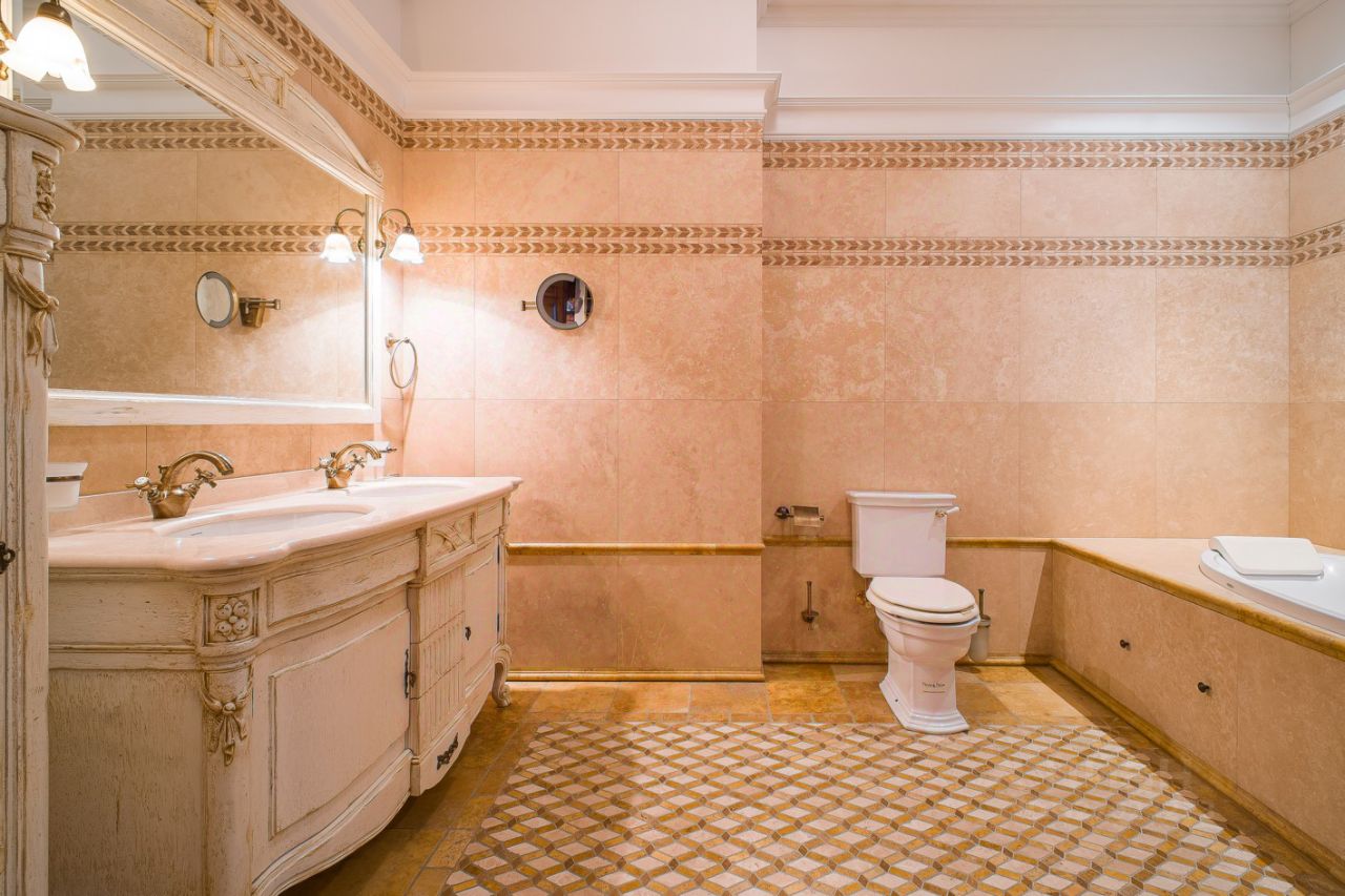2 полноценных с/у, на полу итальянский керамогранит с подогревом. Раковины, унитазы, душевая система, смесители от Devon&Devon (Италия), немецкая ванна Hoesch. Свет мягкое карнизное, точечное освещение. Фантастические люстры из Италии Arte Lamp, из хрусталя и цветного венецианского стекла Bella Figura. Электрооборудование Jung. Централизованная приточно-вытяжная вентиляция. Кондиционеры Mitsubishi