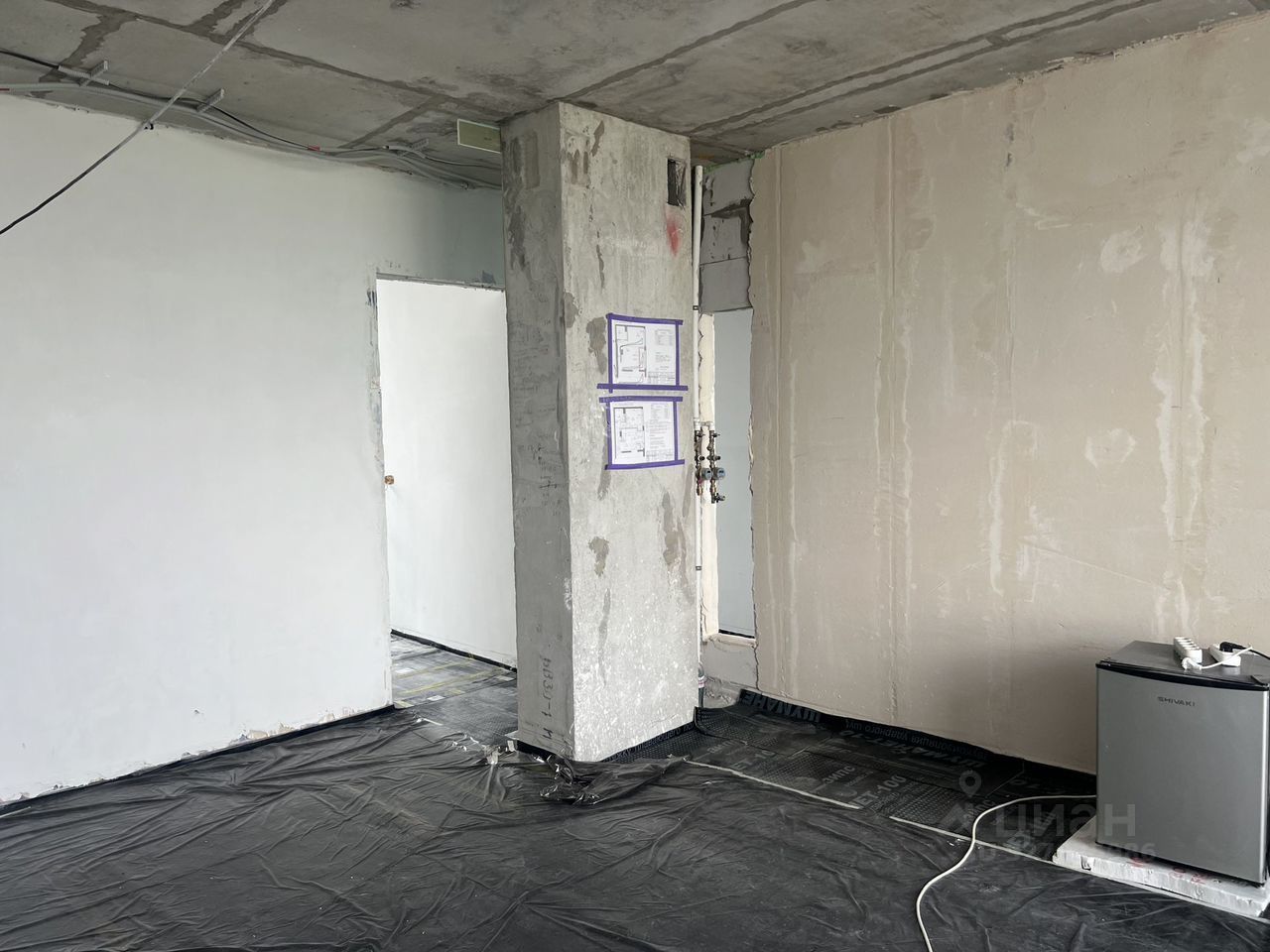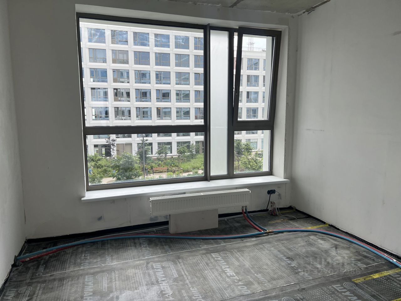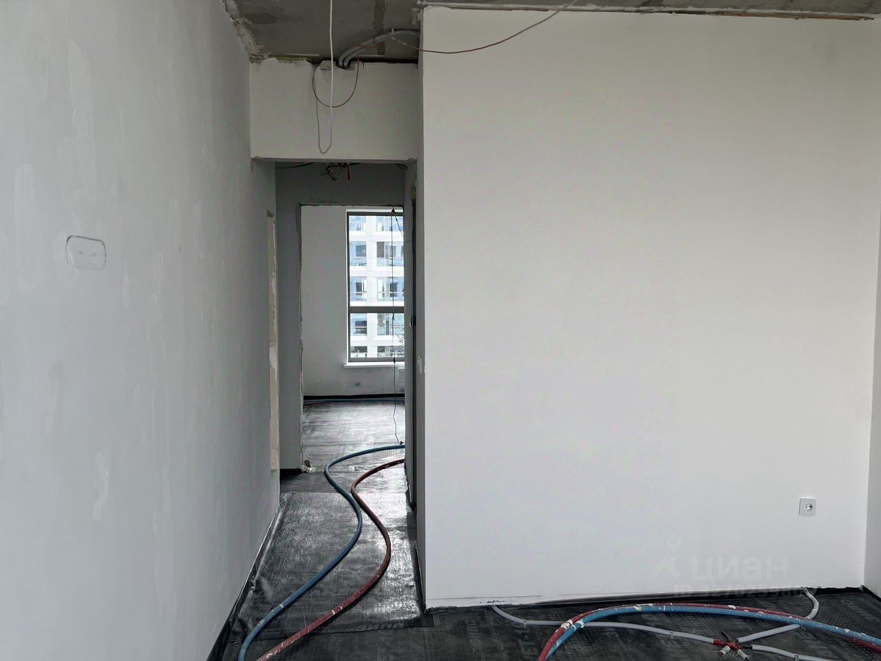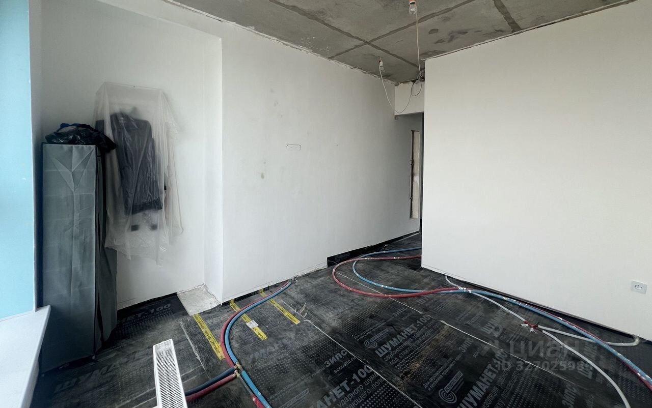 Выполнена подготовка под ремонт. Сделана разводка электрики, стены подготовлены под финишную отделку. Сделаны откосы и разводка в двух санузлах. При входе — большая гардеробная.