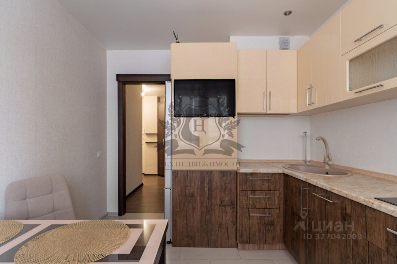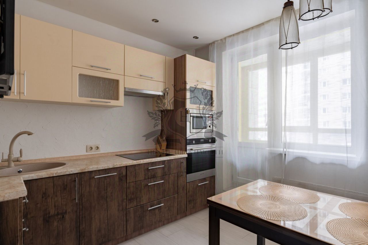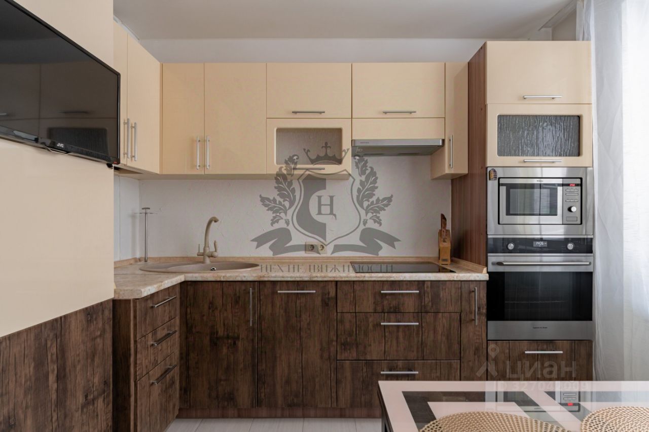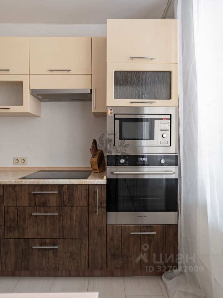 Просторная кухня оборудована всей необходимой мебелью и техникой: раковина из натурального камня, духовой шкаф, микроволновая печь, варочная панель, вместительный двухдверный холодильник, удобный раскладывающийся стол, телевизор. Вся мебель и техника (за исключением стульев) остается будущему владельцу. Из кухни выход на застекленный балкон. Комната большая, правильной формы. В комнате остается кровать и телевизор.