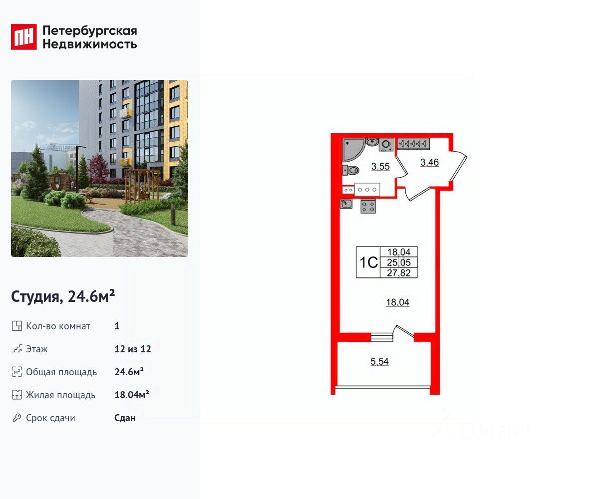 Продается просторная студия в жилом комплексе ''Прайм Приморский'' в динамичном Приморском районе. До метро можно добраться на транспорте всего за 15 минут. Удобная, классическая, функциональная европланировка, просторная прихожая 3.46 м². Общая площадь студии - 24.6 м², жилая 18.04 м², высота потолка 3.07 м. Квартира продается с отделкой ''Норд Лайн серый комфорт''. Что особенного в ЖК ''Прайм Приморский''? • Живописные виды на Шуваловский карьер и лесной массив • ''Парящие'' французские балконы • Центральная входная группа • Креативное пространство в центре проекта, летняя терраса для отдыха • Приватные лаундж-зоны на крыше домов (3 корпус)