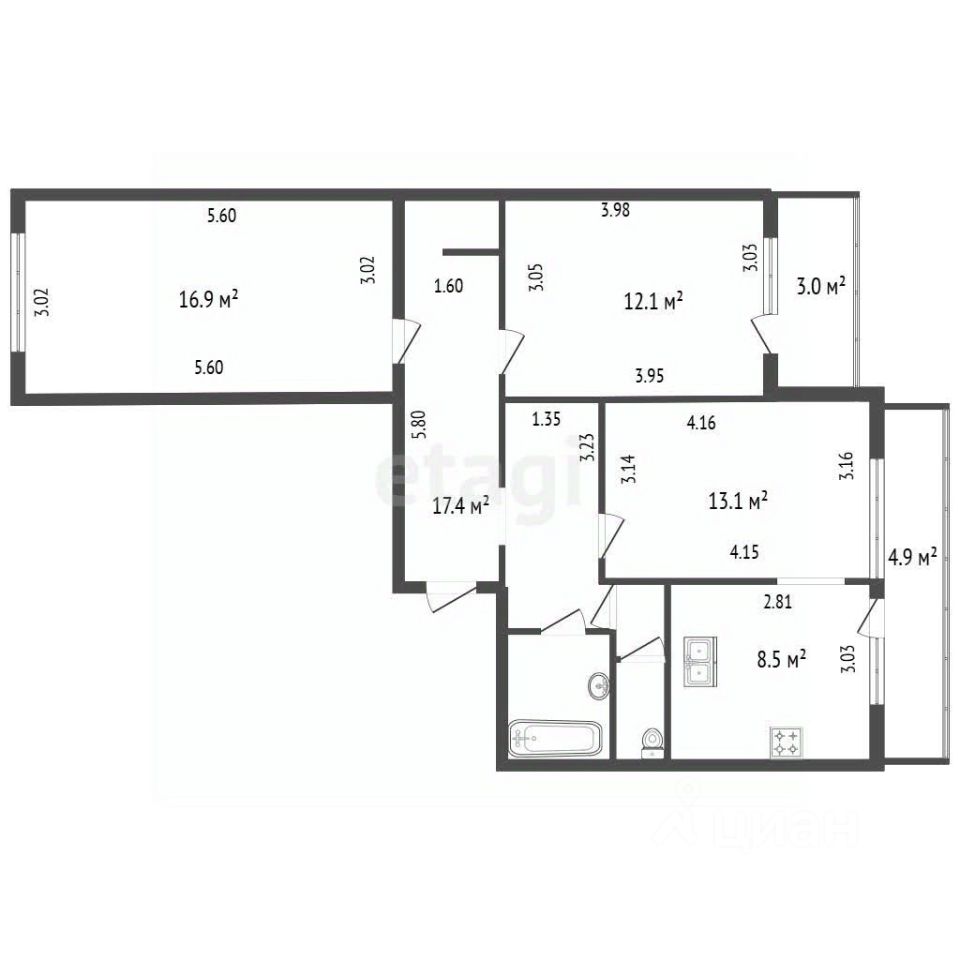 О квартире: + Планировка правильной формы, комнаты (16,9м, 12,1м и 13,1м), кухня (8,5м). + Организованы 2 вместительные кладовые. + 2 больших застеклённых балкона. + Часть мебели и техники остаётся новому владельцу.