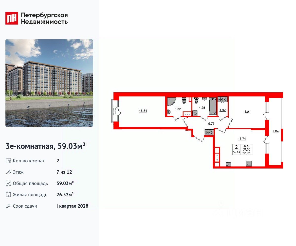 Удобная, классическая, функциональная европланировка, большая кухня-гостиная 16.74 м², вместительная прихожая 5.75 м². Общая площадь квартиры - 59.03 м², жилая 26.52 м², высота потолка 2.77 м.