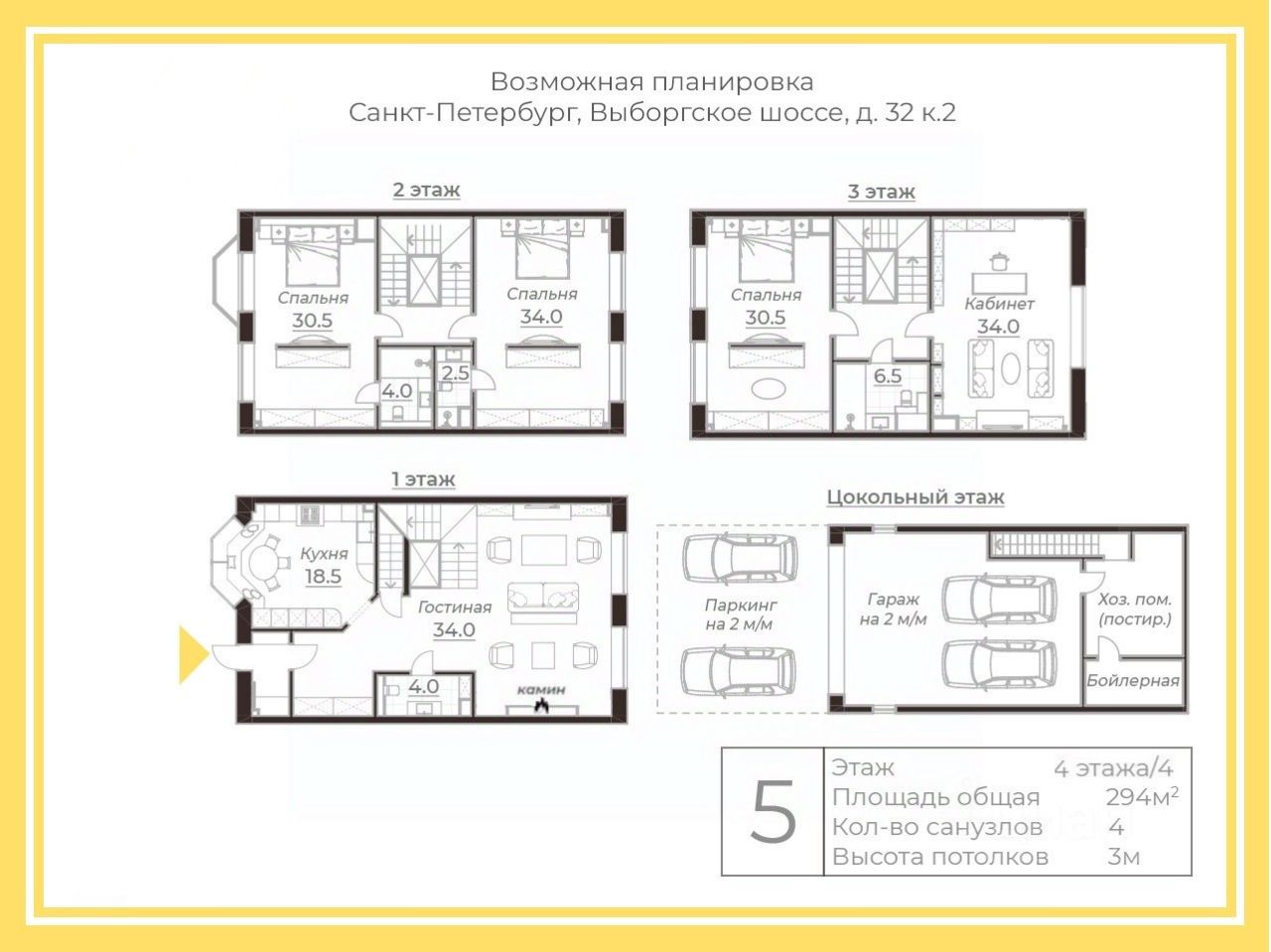 ТАУНХАУС 4-этажный дом с подземным паркингом. В вашем распоряжении несколько просторных спален, несколько санузлов, светлая просторная гостиная, кабинет. Пространство площадью 294 кв. м органично распределено на 4 этажа. Два входа. Возможность установки персонального лифта! Для удобства восприятия пространства среди фотографий размещены визуализации интерьера (то, каким может быть пространство)