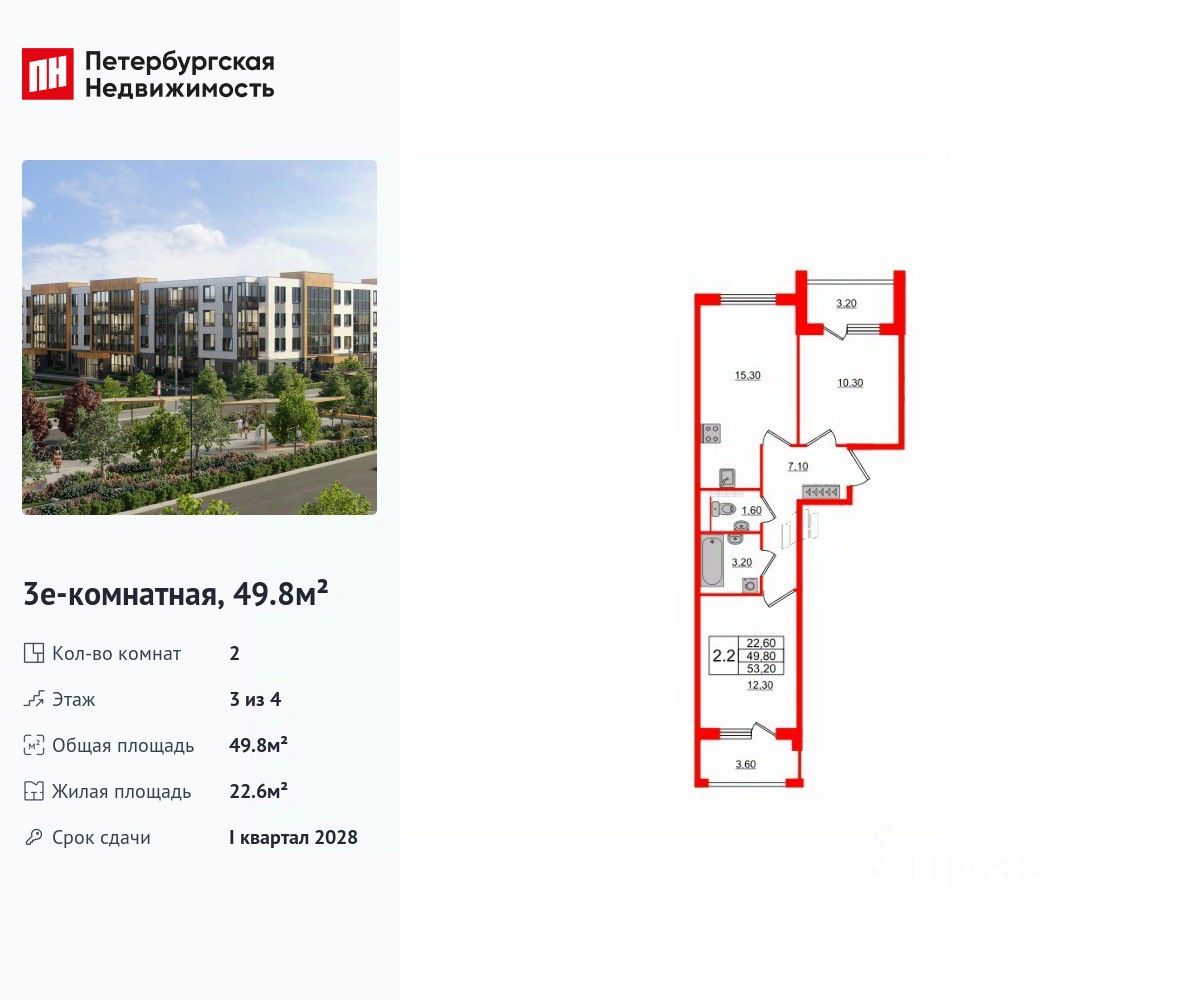 Удобная, классическая, функциональная европланировка, большая кухня-гостиная 15.3 м², вместительная прихожая 7.1 м². Общая площадь квартиры - 49.8 м², жилая 22.6 м², высота потолка 2.78 м.