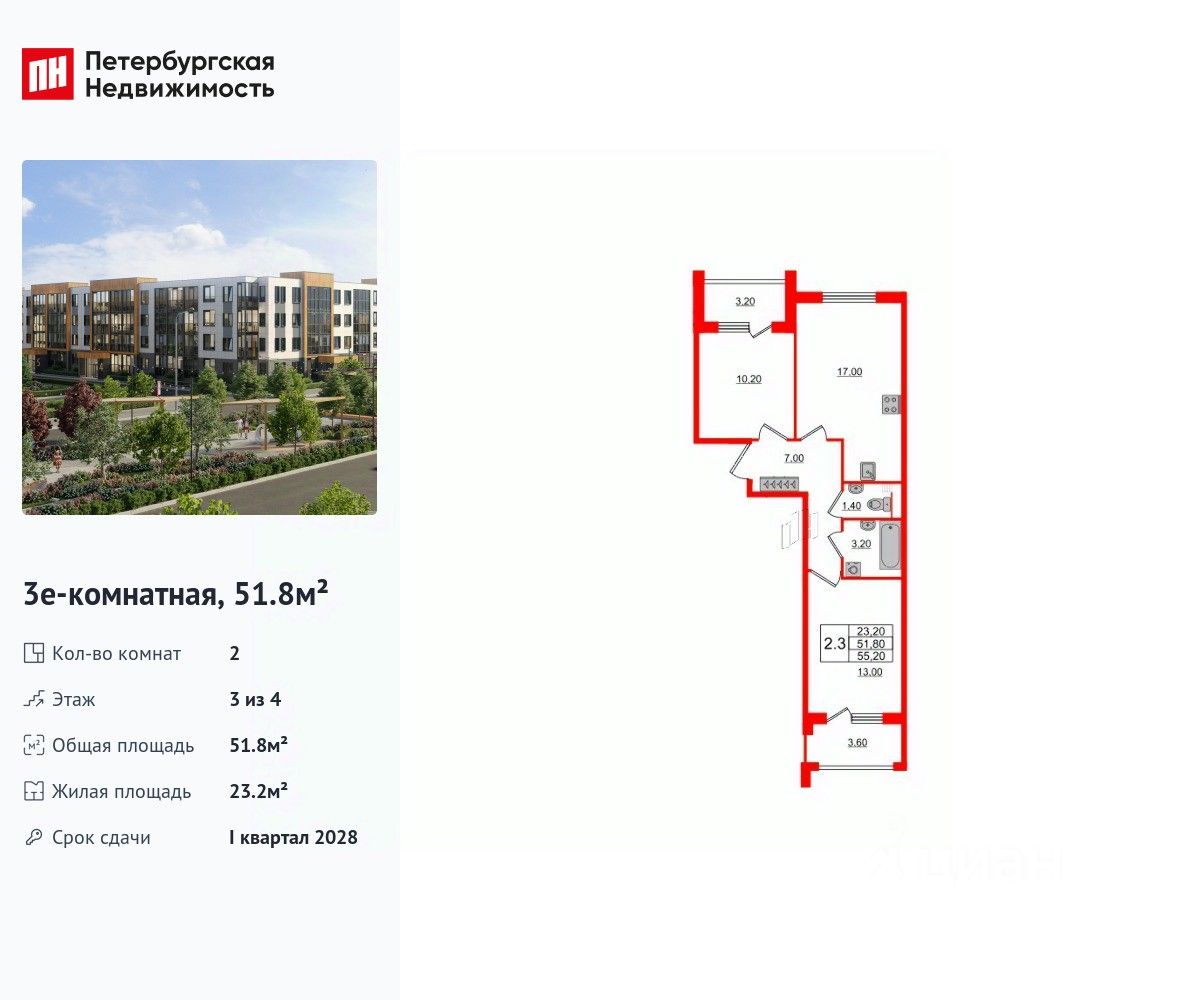 Удобная, классическая, функциональная европланировка, большая кухня-гостиная 17 м², вместительная прихожая 7 м². Общая площадь квартиры - 51.8 м², жилая 23.2 м², высота потолка 2.78 м.