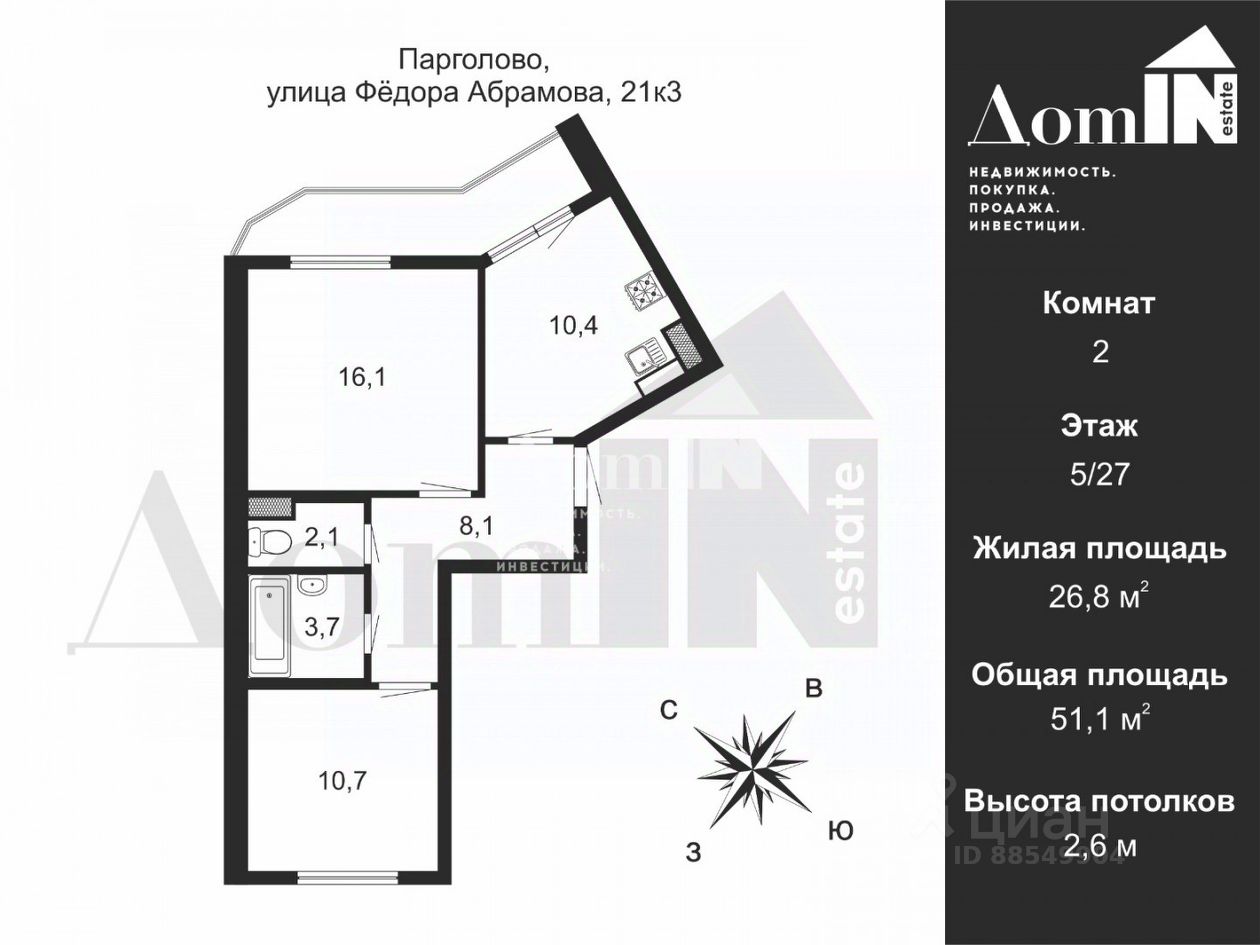 Арт. 131352485 Продам 2 комнатную квартиру. Общая площадь 51,1м2. Комнаты раздельные 16.1+10.7. Кухня 10,4 с выходом на застеклённую лоджию. Комнаты на две стороны дома. Санузел раздельный. Установлены счётчики на воду. Электрическая плита. Металлическая входная дверь. Соседи, все приличные. Три лифта, грузовой и 2 пассажирских. Дом кирпичный, тёплый 2017 г. п. Во дворе школа и детский садик В 5 минутах от дома автобусная остановка. Станция метро Парнас 10 минут транспортом. Один взрослый собственник. Продаём впервые. Квартиру приобретали у застройщика по ДДУ. Обременений и долгов нет. Встречная покупка. Звоните. Сопровождение сделки вам в подарок. Помощь в одобрении ипотеки у банков партнёров. Юридически чистая сделка.