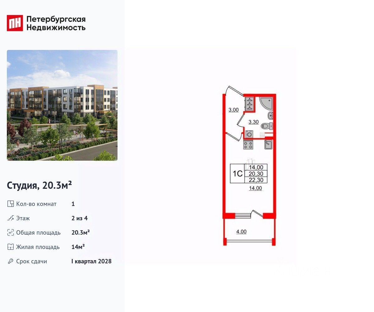 Удобная, классическая, функциональная европланировка, вместительная прихожая 3 м². Общая площадь студии - 20.3 м², жилая 14 м², высота потолка 2.78 м.