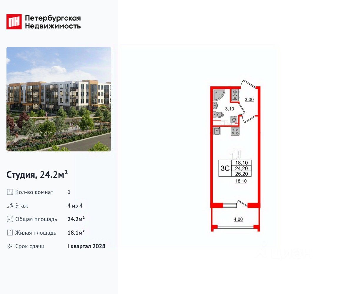 Удобная, классическая, функциональная европланировка, вместительная прихожая 3 м². Общая площадь студии - 24.2 м², жилая 18.1 м², высота потолка 3.04 м.