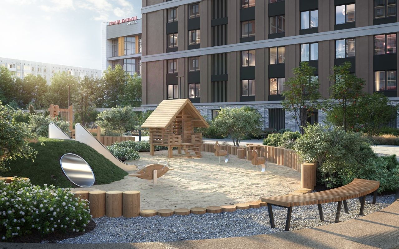 На территории дома появятся сразу два живописных парка с карельской природой, один из которых будет доступен только для резидентов. Приватные пространства двух очередей соединит ''скрипичный ключ'' пешеходного моста, а вдоль дома к общественному парку, который строится для города в рамках проекта, будет проложен пешеходный бульвар с кафе и магазинами.