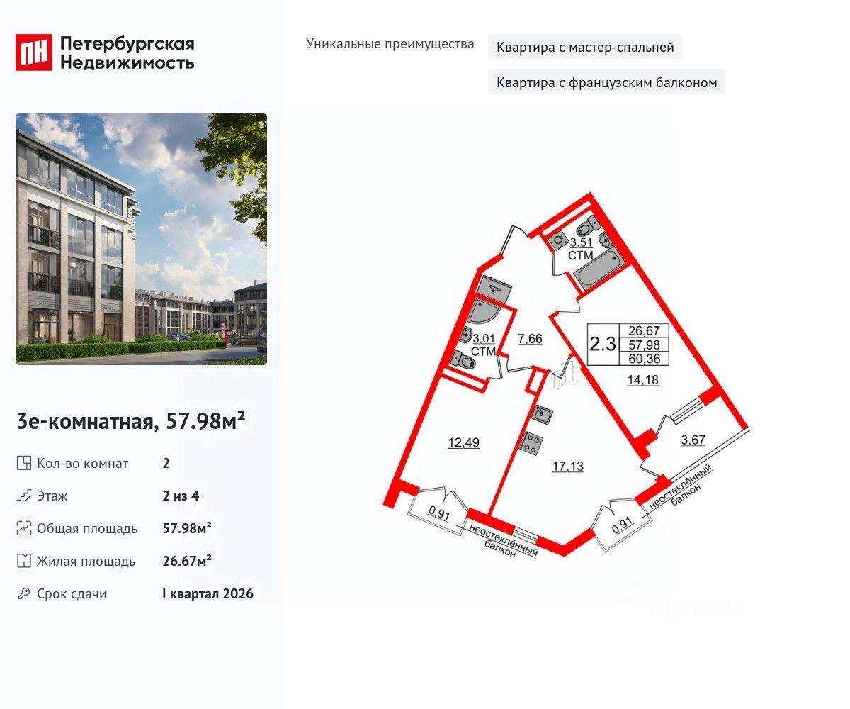 Общая площадь57,98 м2