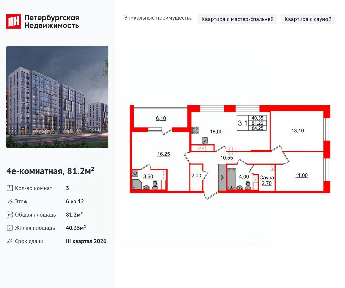 Уникальная, функциональная европланировка, большая кухня-гостиная 18 м², вместительная прихожая 10.55 м². Общая площадь квартиры - 81.2 м², жилая 40.35 м², высота потолка 2.77 м.