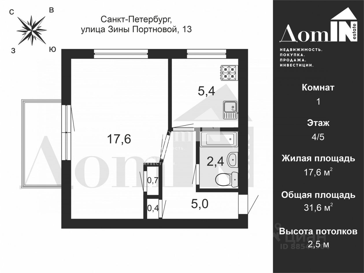 Продается 1-комнатная квартира в теплом кирпичном доме, общей площадью 31.6 кв.м в Красносельском районе Санкт-Петербурга.
