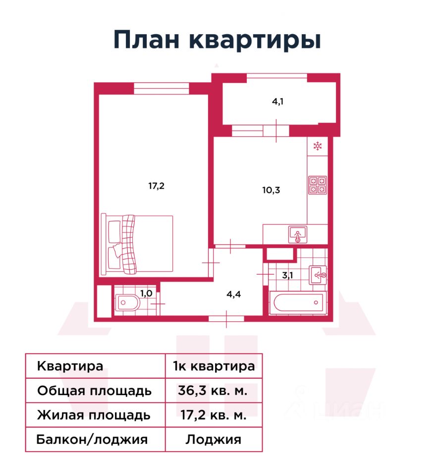 О квартире: Общая площадь 36,3 м². Комната 17,2 м² правильной формы. Кухня с выходом на лоджию. Раздельный санузел. Отделка White Box (предчистовая): все ''грязные'' работы уже выполнены (стяжка, штукатурка, разводка коммуникаций). Остаётся только косметическая отделка под ваш стиль — без необходимости переделывать чужой ремонт.