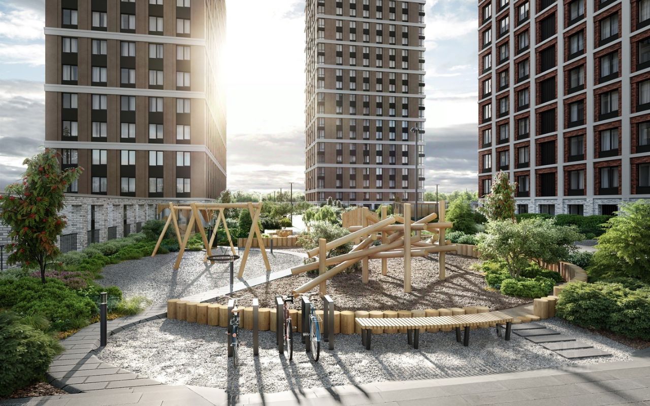 На территории дома появятся сразу два живописных парка с карельской природой, один из которых будет доступен только для резидентов. Приватные пространства двух очередей соединит ''скрипичный ключ'' пешеходного моста, а вдоль дома к общественному парку, который строится для города в рамках проекта, будет проложен пешеходный бульвар с кафе и магазинами.
