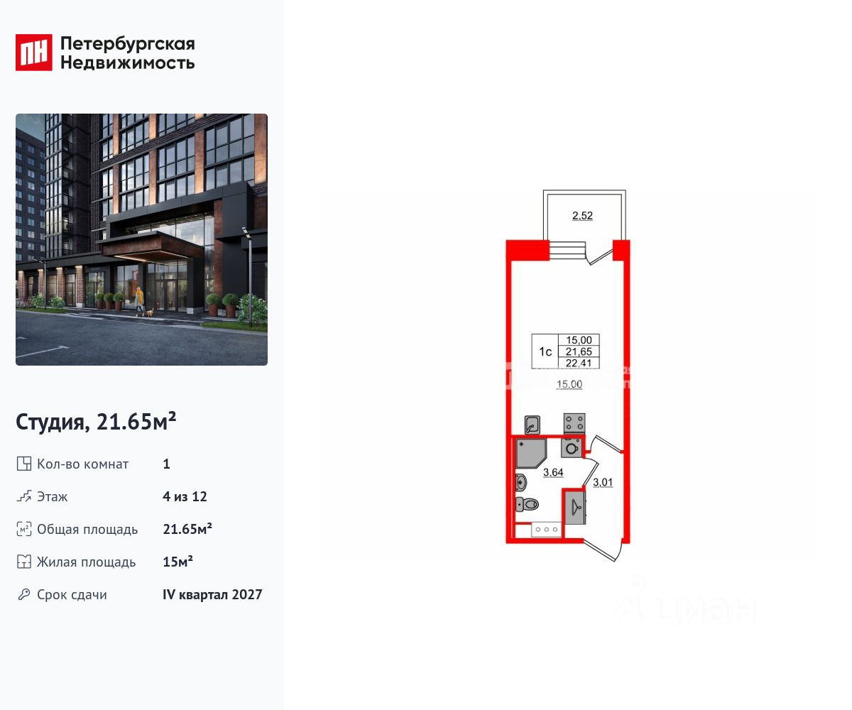 Удобная, классическая, функциональная европланировка, вместительная прихожая 3.01 м². Общая площадь студии - 21.65 м², жилая 15 м², высота потолка 2.75 м.