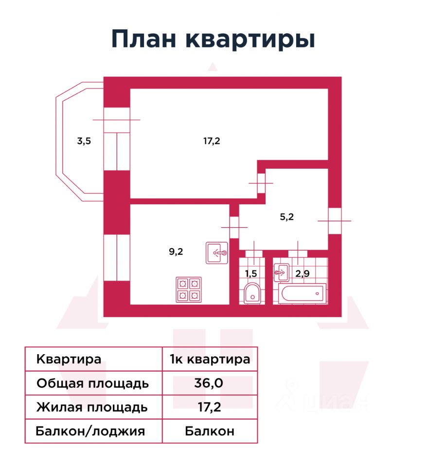 • Кухня 9,2 кв. м, комната 17,2 кв.м.