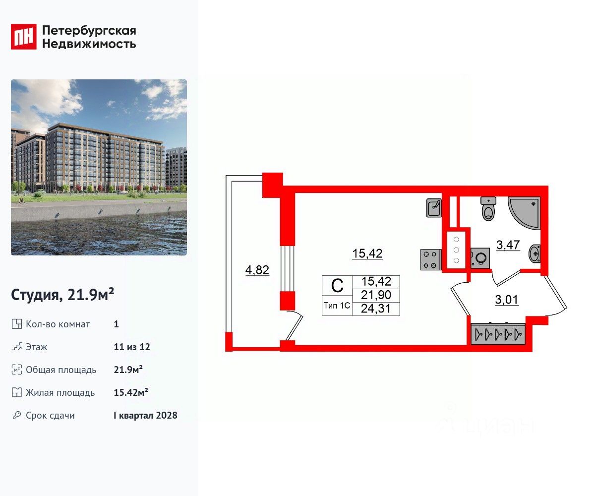 Удобная, классическая, функциональная европланировка, вместительная прихожая 3.01 м². Общая площадь студии - 21.9 м², жилая 15.42 м², высота потолка 2.77 м.