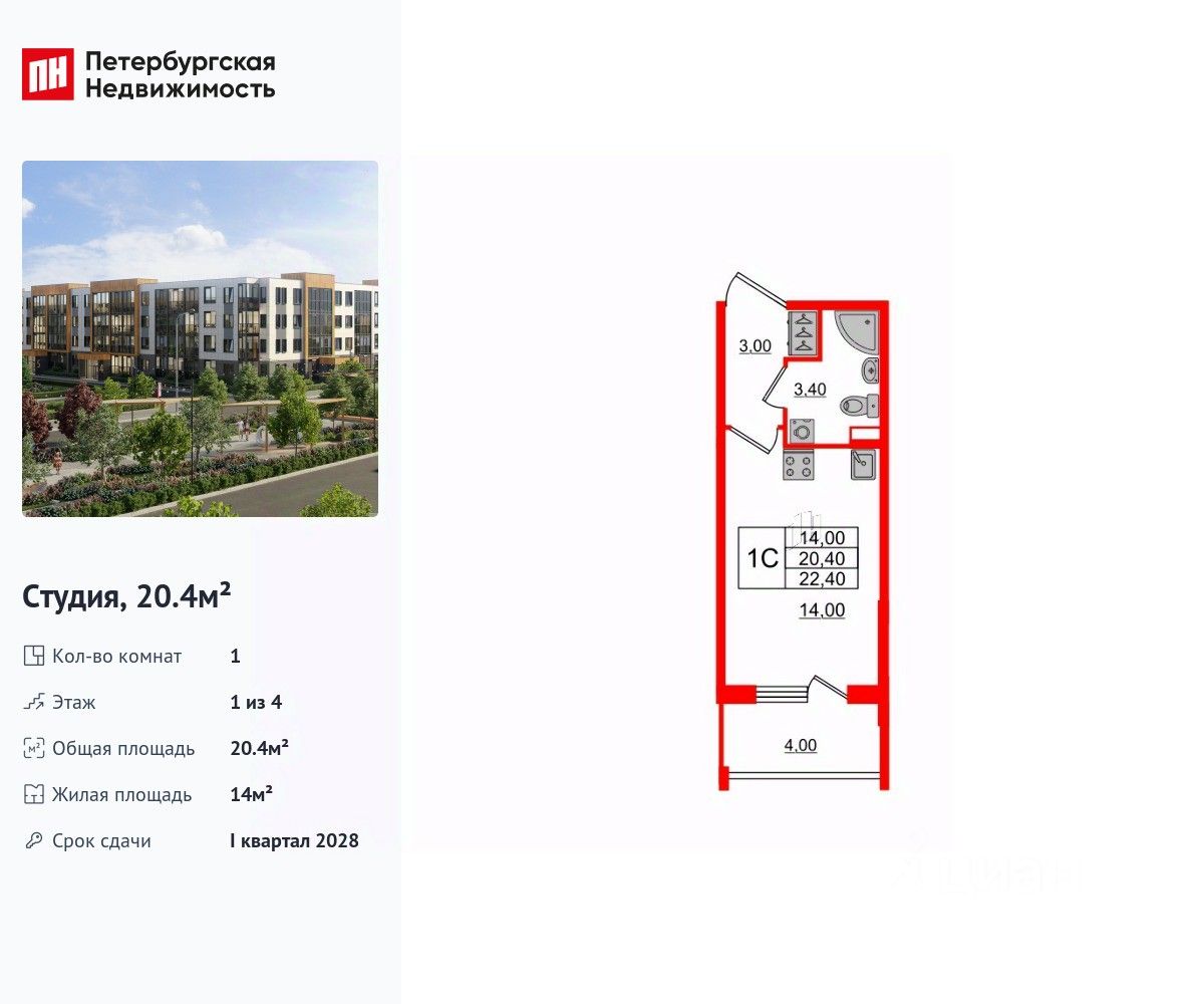 Удобная, классическая, функциональная европланировка, вместительная прихожая 3 м². Общая площадь студии - 20.4 м², жилая 14 м², высота потолка 2.78 м.