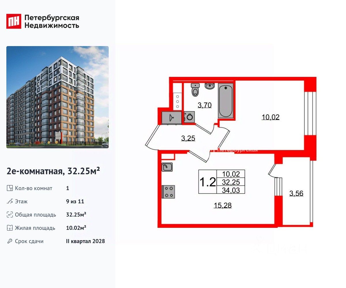 Удобная, классическая, функциональная европланировка, большая кухня-гостиная 15.28 м², вместительная прихожая 3.25 м². Общая площадь квартиры - 32.25 м², жилая 10.02 м², высота потолка 2.77 м.