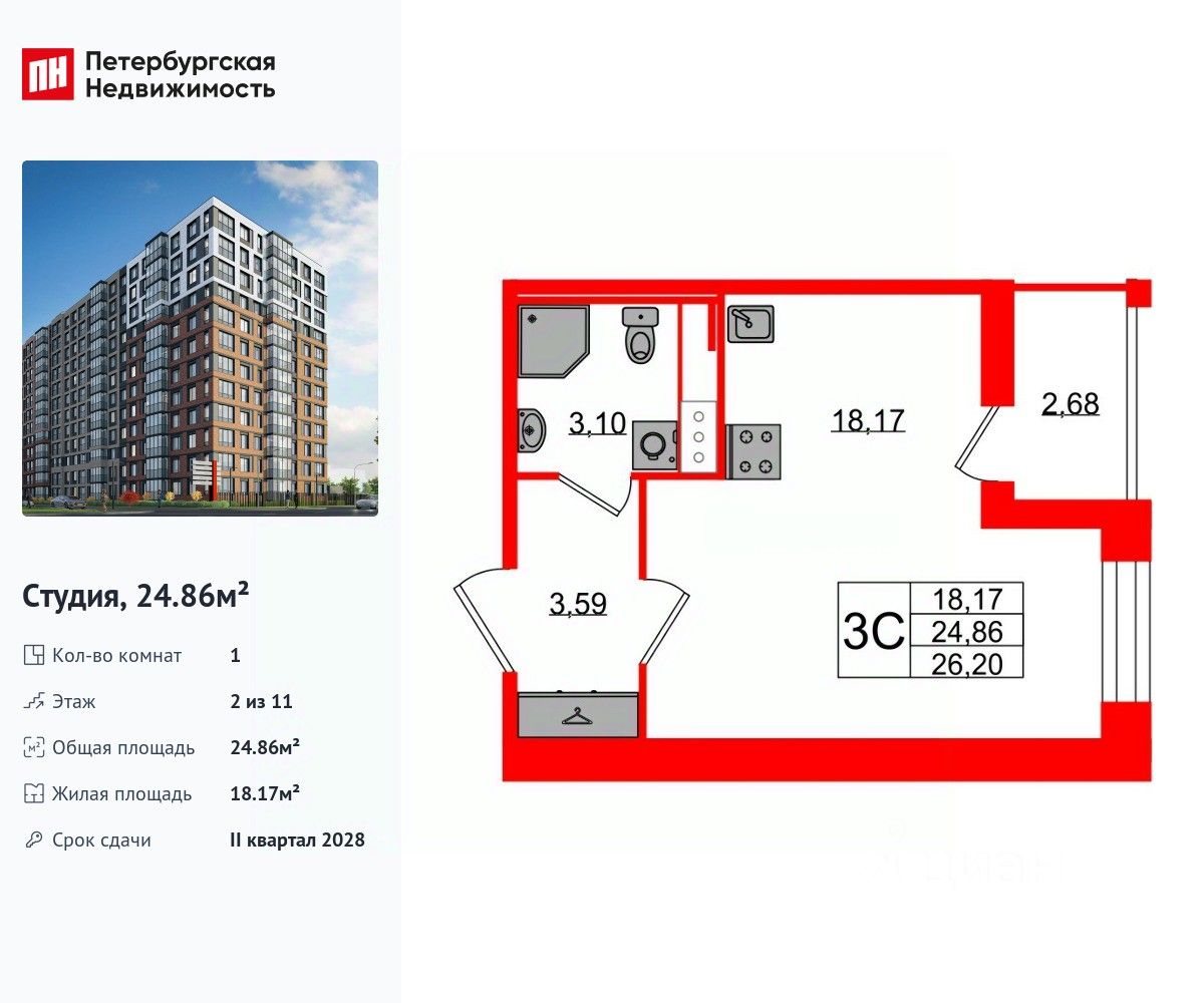 Удобная, классическая, функциональная европланировка, просторная прихожая 3.59 м². Общая площадь студии - 24.86 м², жилая 18.17 м², высота потолка 2.77 м.