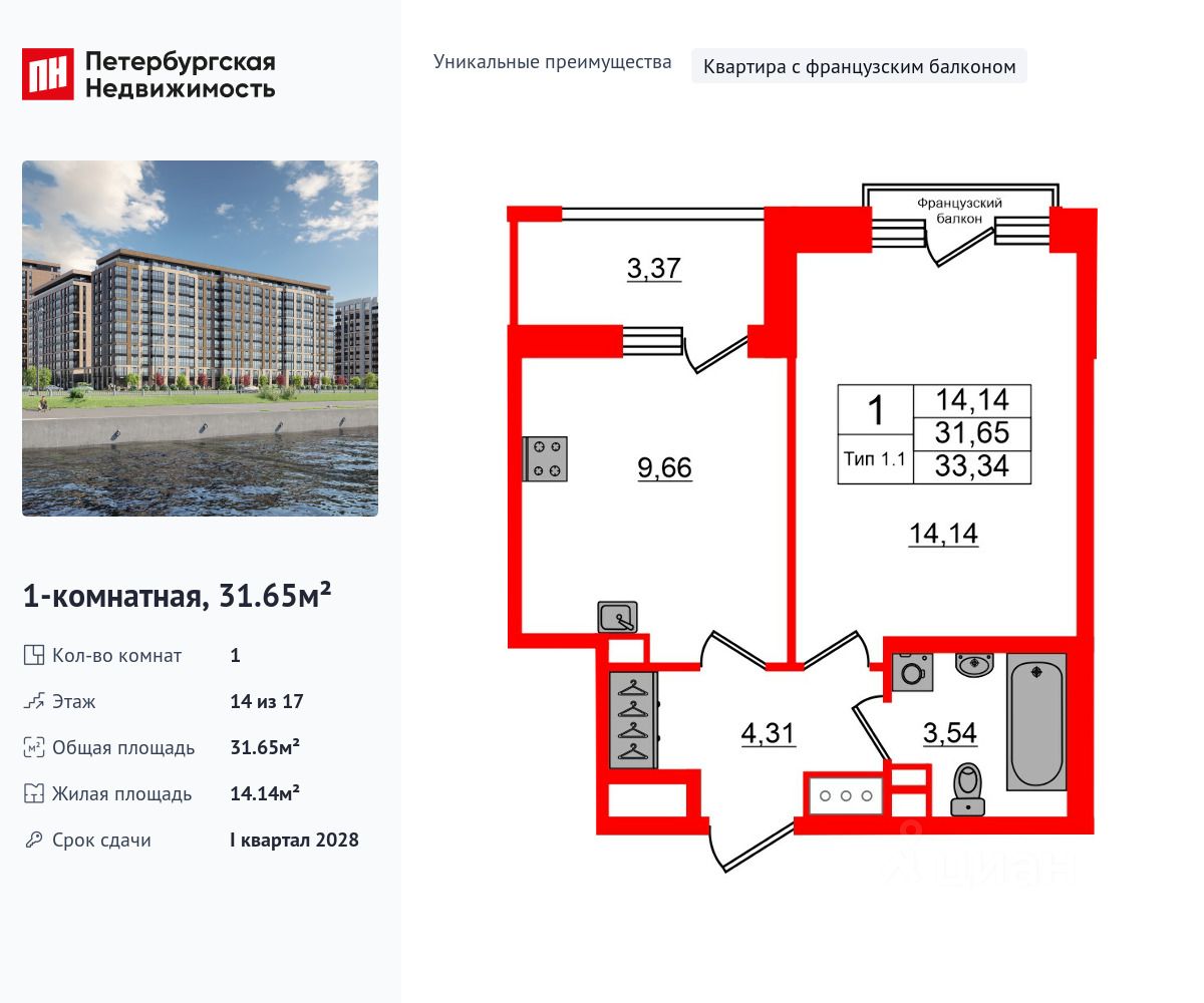 Уникальная планировка, кухня 9.66 м², просторная прихожая 4.31 м². Общая площадь квартиры - 31.65 м², жилая 14.14 м², высота потолка 2.77 м.