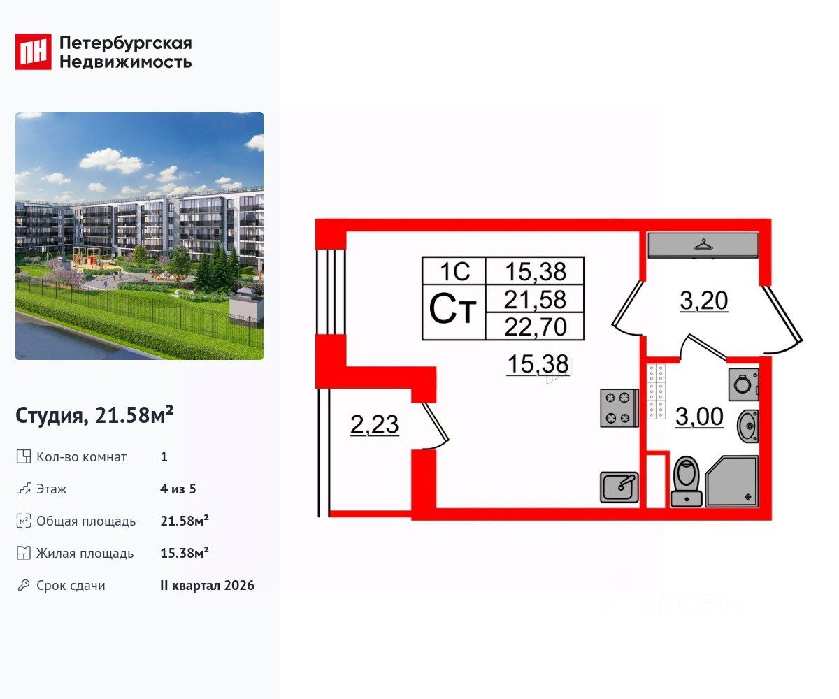 Удобная, классическая, функциональная европланировка, вместительная прихожая 3.2 м². Общая площадь студии - 21.58 м², жилая 15.38 м², высота потолка 2.77 м.