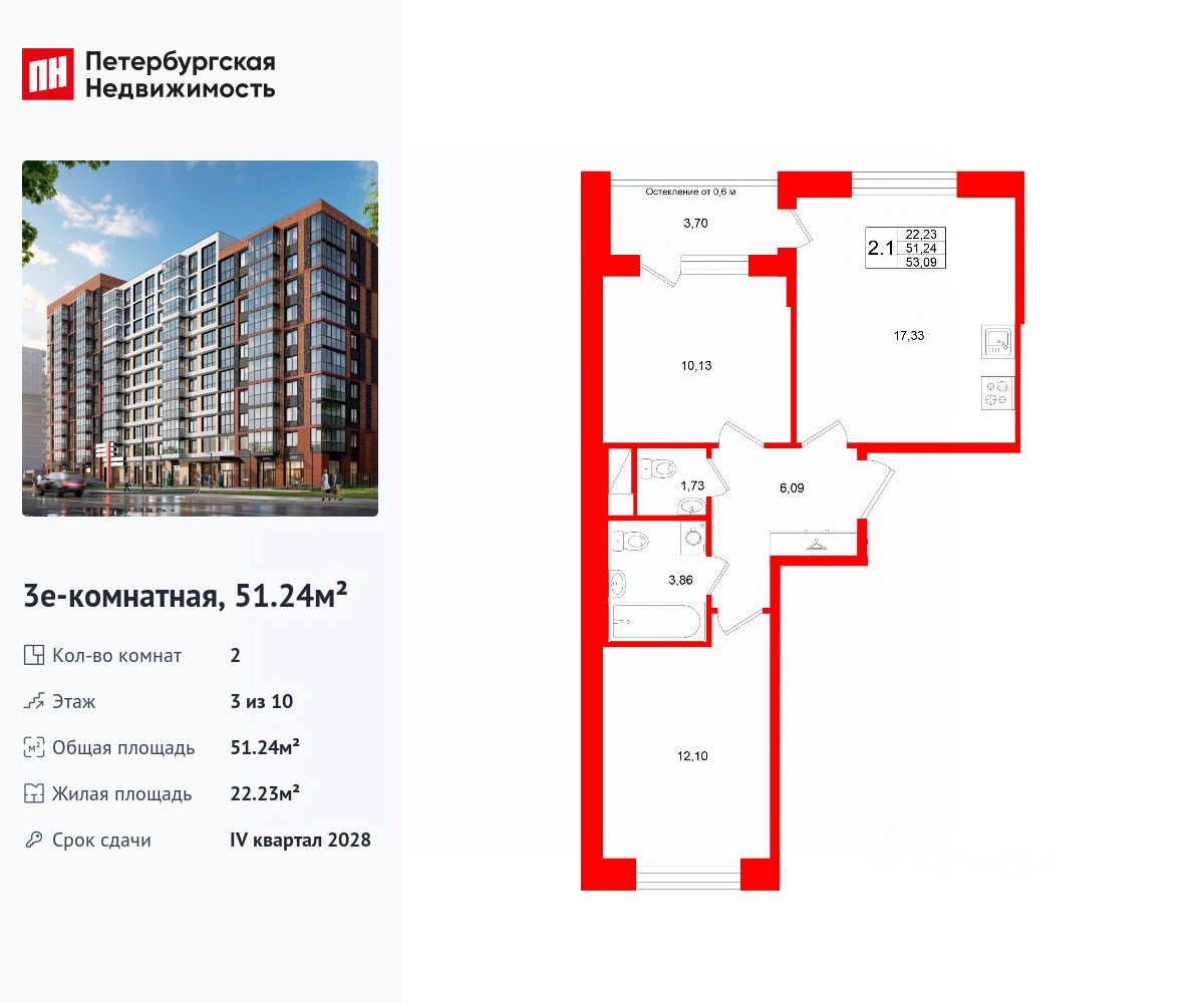 Удобная, классическая, функциональная европланировка, большая кухня-гостиная 16.73 м², вместительная прихожая 6.09 м². Общая площадь квартиры - 51.24 м², жилая 22.23 м², высота потолка 2.77 м.