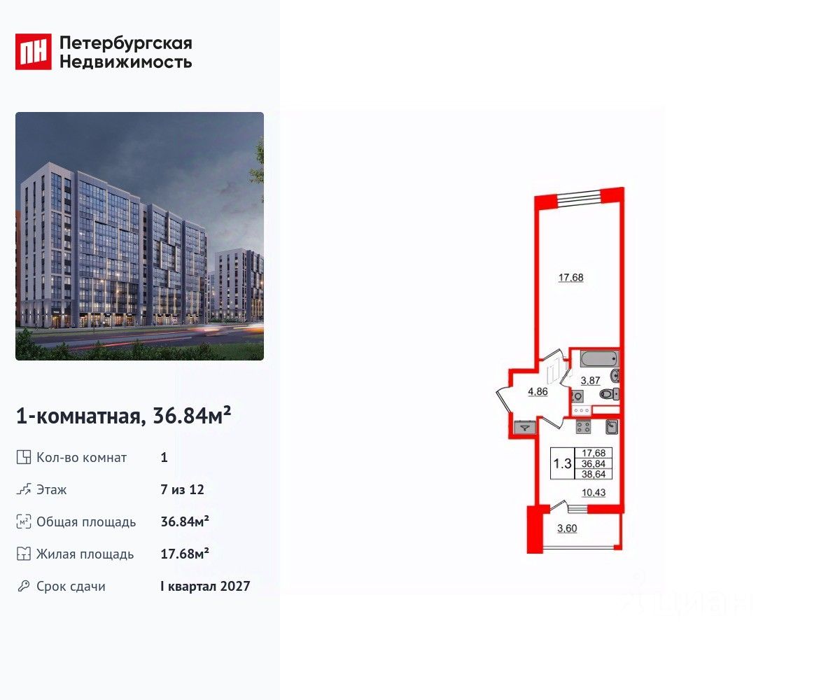 Удобная, классическая планировка, кухня 10.43 м², просторная прихожая 4.86 м². Общая площадь квартиры - 36.84 м², жилая 17.68 м², высота потолка 2.77 м.