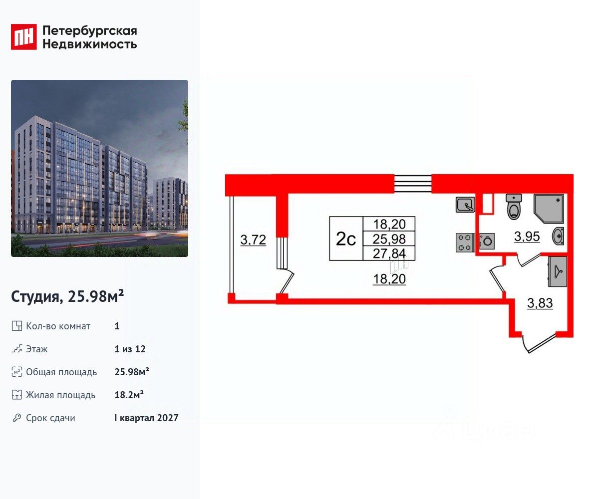 Удобная, классическая, функциональная европланировка, просторная прихожая 3.83 м². Общая площадь студии - 25.98 м², жилая 18.2 м², высота потолка 2.77 м.