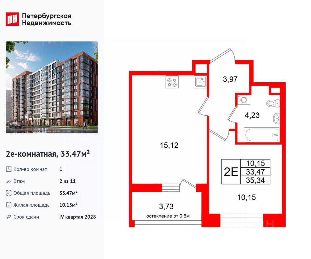 Удобная, классическая, функциональная европланировка, большая кухня-гостиная 15.12 м², вместительная прихожая 3.97 м². Общая площадь квартиры - 33.47 м², жилая 10.15 м², высота потолка 2.77 м.
