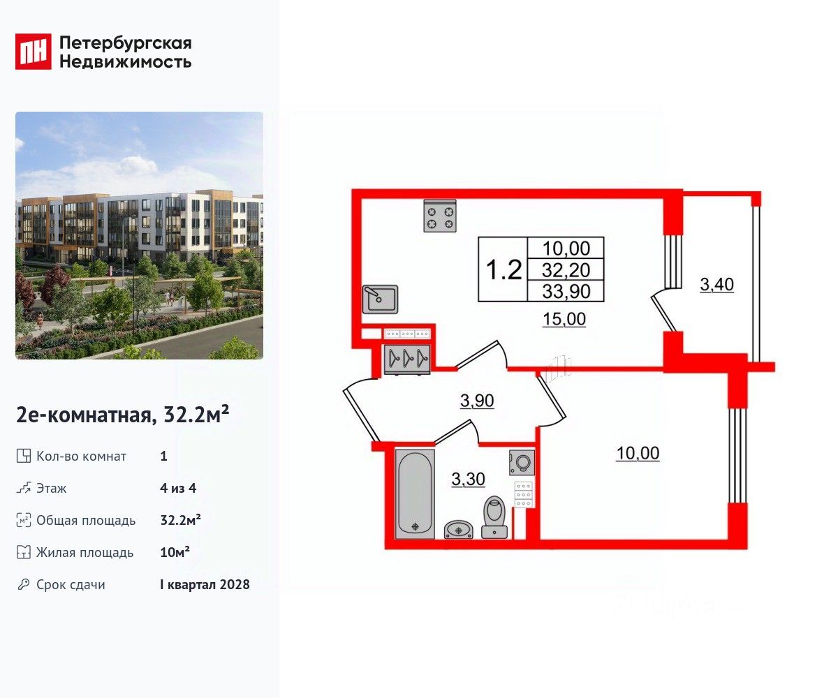 Удобная, классическая, функциональная европланировка, большая кухня-гостиная 15 м², вместительная прихожая 3.9 м². Общая площадь квартиры - 32.2 м², жилая 10 м², высота потолка 3.04 м.