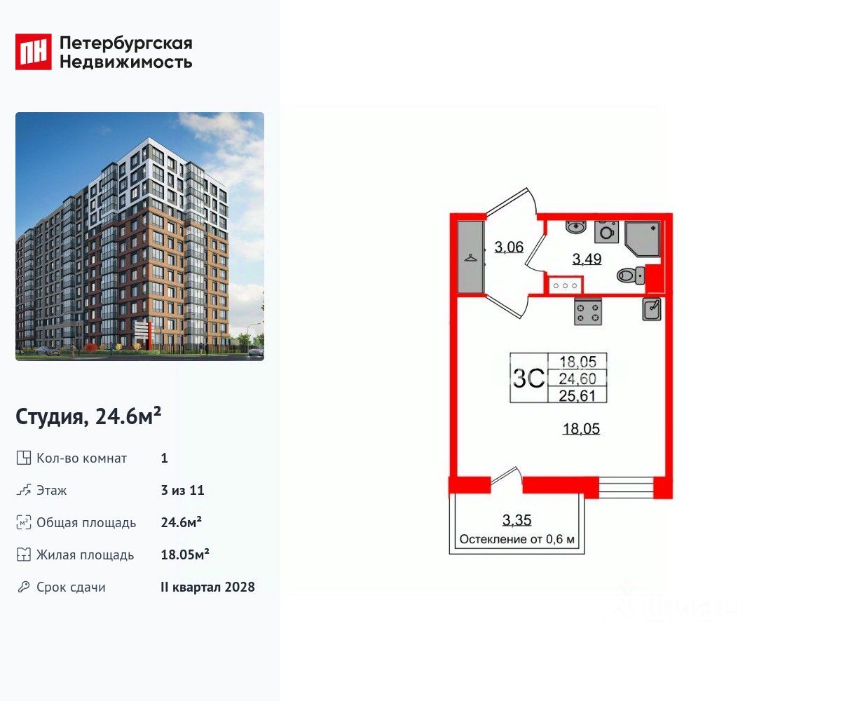 Удобная, классическая, функциональная европланировка, вместительная прихожая 3.06 м². Общая площадь студии - 24.6 м², жилая 18.05 м², высота потолка 2.77 м.