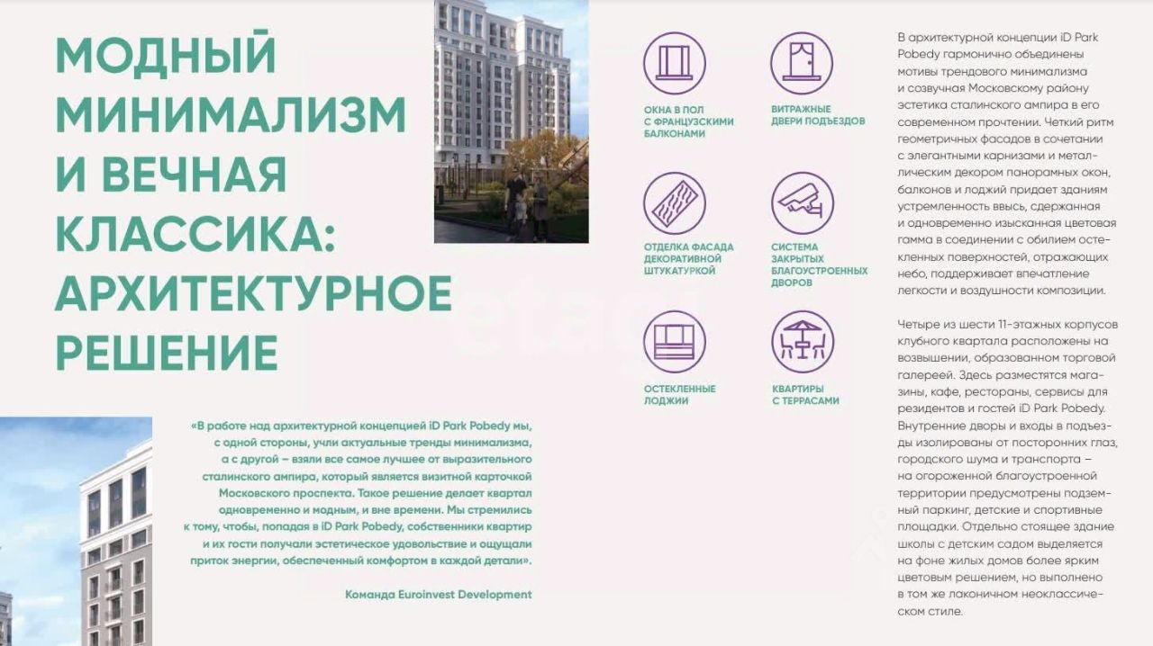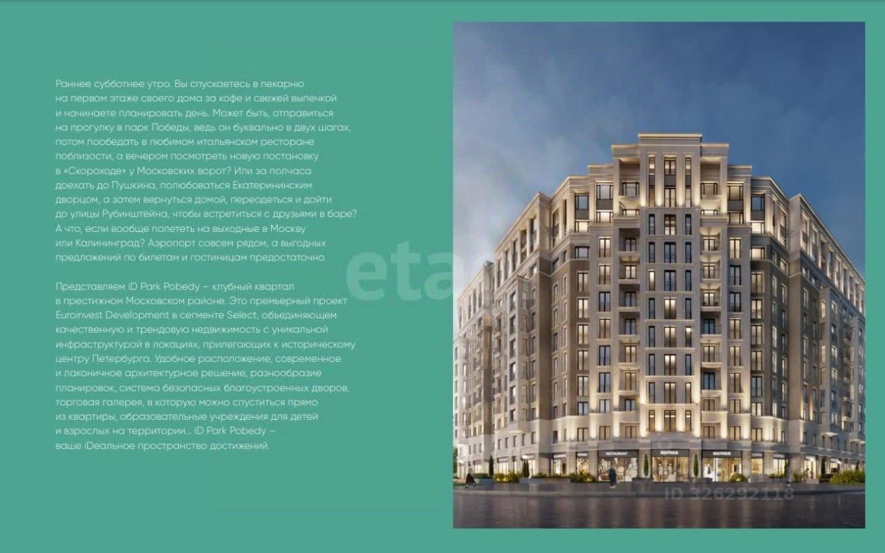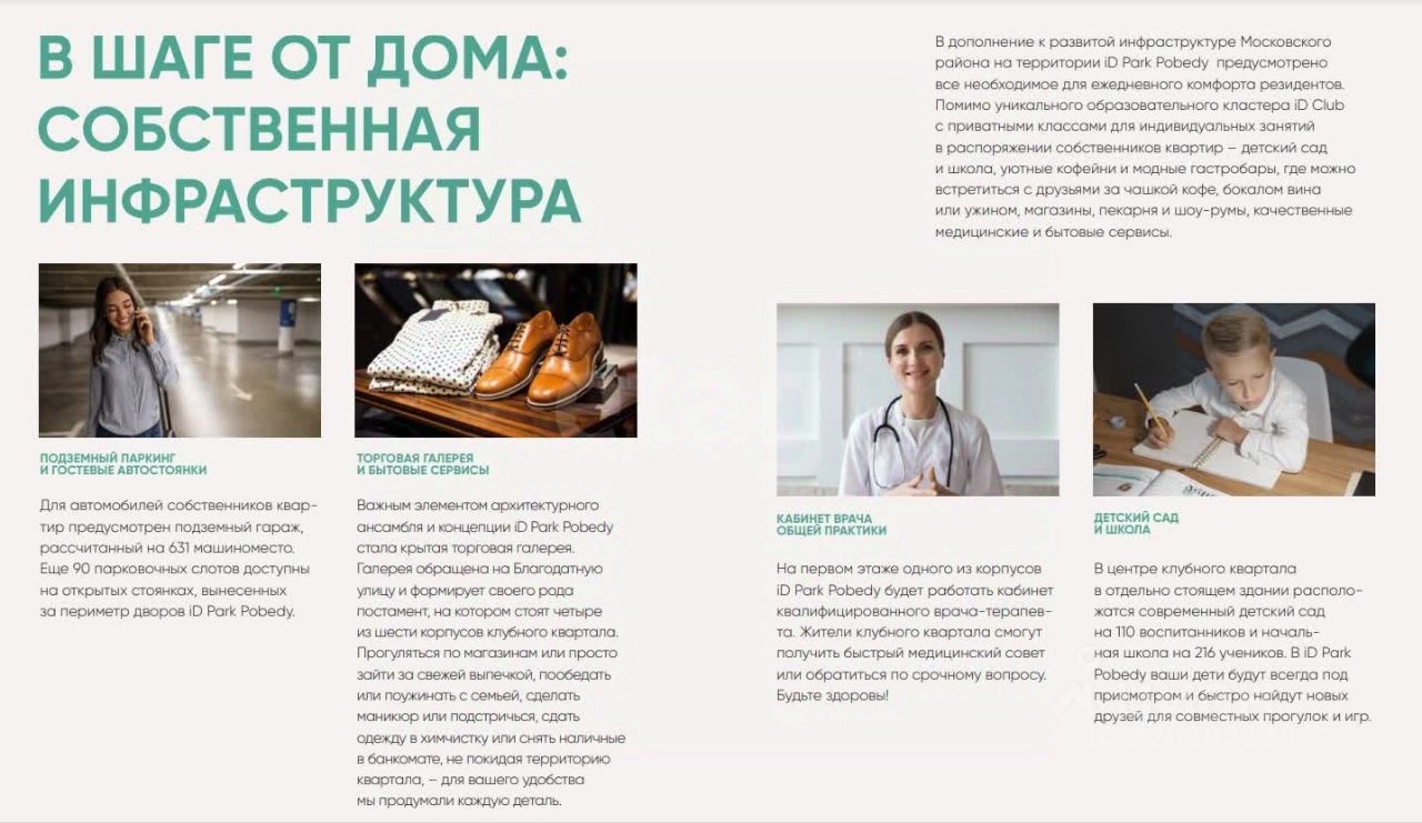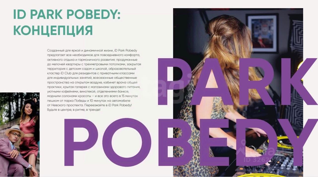 iD Park Pobedy предлагает все необходимое для повседневного комфорта, активного отдыха и гармоничного развития: - продуманные до мелочей квартиры с трехметровыми потолками, - закрытая территория с детским садом и школой, - образовательный кластер iD Club для резидентов с приватными классами для индивидуальных занятий, - всесезонные общественные пространства на открытом воздухе, - кабинет врача общей практики, - крытая галерея с магазинами здорового питания, уютными кофейнями, винотекой, отделениями банков, модными салонами красоты