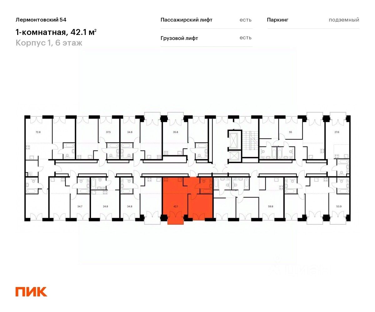 Продаётся 1-комн. квартира площадью 41,6 кв.м на 6 этаже 9 этажного дома (Корпус 1, Секция 6) проекта ПИК Лермонтовский 54. Светлый просторный подъезд на уровне земли, функциональная планировка, большие окна, предчистовая отделка.