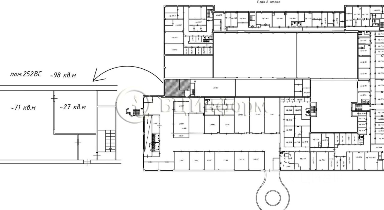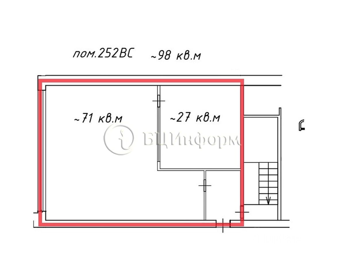 Вниманию арендаторов предлагается помещение свободного назначения (под офиса, магазина, шоу-рума и т.д.). Площадь - 98 кв.м. Расположено на 2-м этаже Бизнес-Центра. Помещение состоит из двух комнат (~71 м.кв. и 27 м.кв.). В хорошем состоянии. Выполнена стандартная офисная отделка. Стены - покраска, напольное покрытие - плитка, подвесные потолки ''Армстронг''.