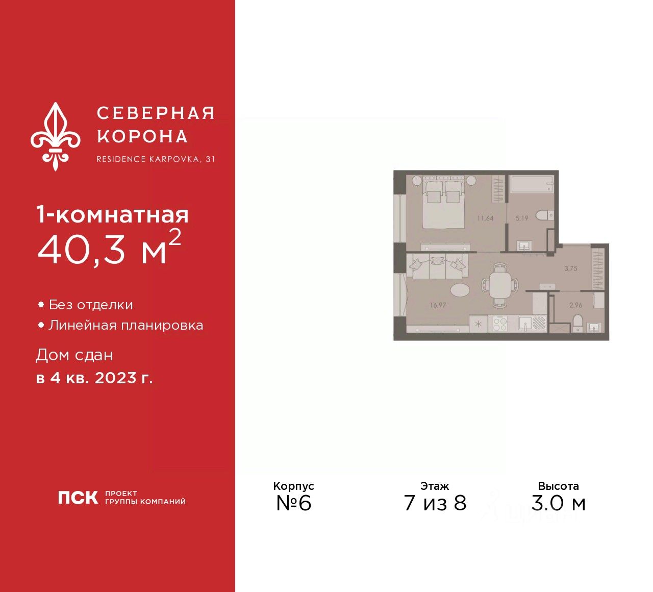 Однокомнатная квартира в ЖК ''Северная корона'' на 7 этаже. Квартира без отделки, полностью готова к ремонту. Общая площадь: 40.3 кв.м., жилая: 11.64 кв.м., площадь просторной кухни-столовой: 16.97 кв.м. Все окна выходят на одну сторону. В квартире один совмещенный и один раздельный санузел. Высота потолков 3.0 м.