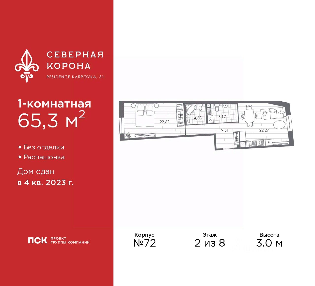 1-комн. квартира от застройщика в ЖК ''Северная корона'' на 2 этаже. Квартира без отделки, после выдачи ключей можно делать ремонт. Общая площадь: 65.3 кв.м., жилая: 22.62 кв.м., площадь просторной кухни-столовой: 22.27 кв.м. Квартира - распашонка, без проходных комнат, окна выходят на paзные стороны дома. В квартире два совмещенных санузла. Высота потолков 3.0 м.