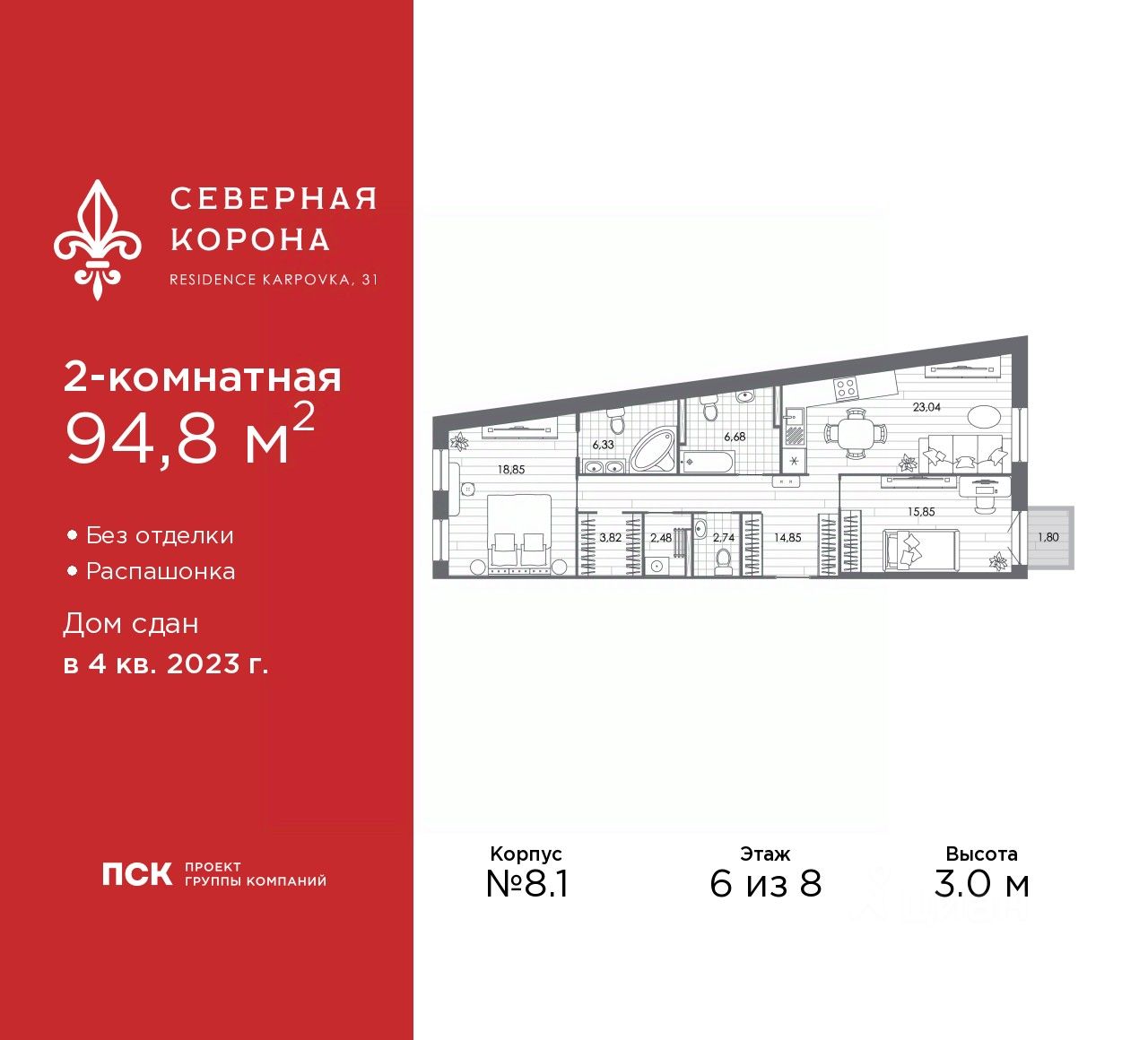 2-комн. квартира от застройщика в ЖК ''Северная корона'' на 6 этаже. Квартира без отделки, после оформления собственности можно делать ремонт. Общая площадь: 94.8 кв.м., жилая: 34.7 кв.м., площадь просторной кухни-столовой: 23.04 кв.м. Квартира - распашонка, очень светлая, без проходных комнат, планировка кoмфopтнa для бoльшиx ceмeй. В квартире два совмещенных и один раздельный санузел. Высота потолков 3.0 м.