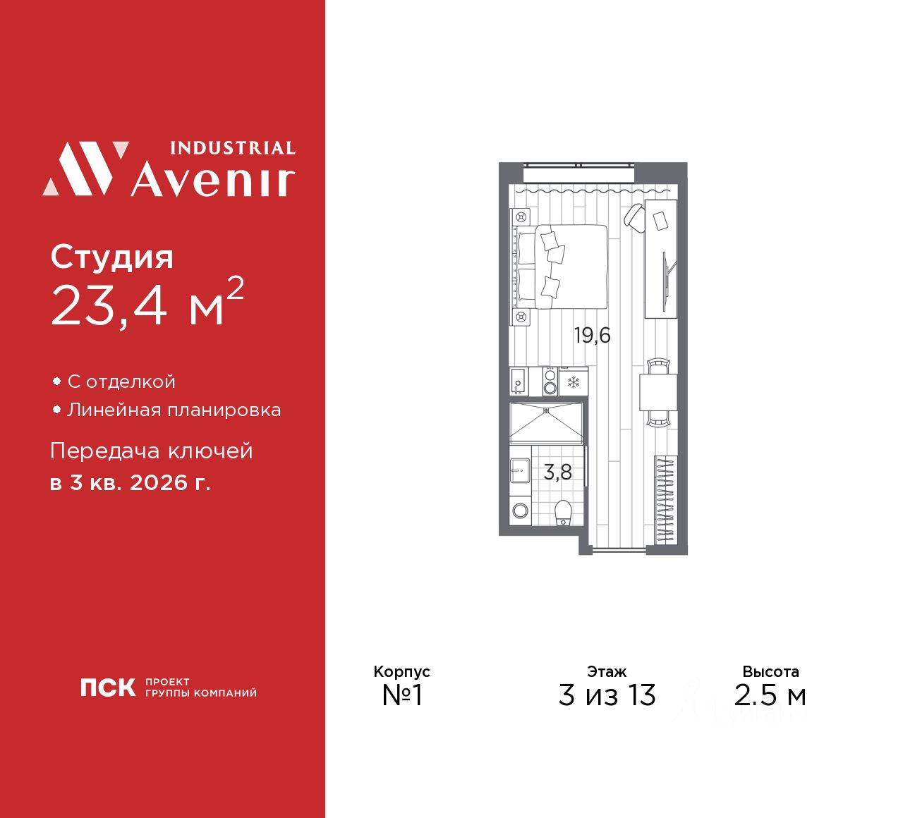 Просторные однокомнатные апартаменты-студия с отделкой в ЖК ''Industrial AVENIR'' на 3 этаже. Общая площадь: 23.4 кв.м., площадь гостиной 19.6 кв.м., из которых 5 кв.м. выделено под кухонную зону. Все окна выходят на одну сторону. В апартаментах один совмещенный санузел. Высота потолков 2.5 м.