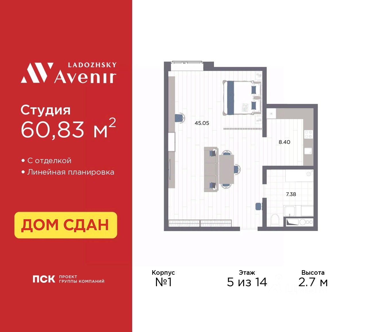 Продаются 1-комн. апартаменты-студия с отделкой в ЖК ''Ladozhsky AVENIR'' на 5 этаже. Общая площадь: 60.83 кв.м., площадь гостиной 53.45 кв.м., из которых 8.4 кв.м. выделено под кухонную зону. Все окна выходят на одну сторону. В апартаментах один совмещенный санузел. Высота потолков 2.7 м.