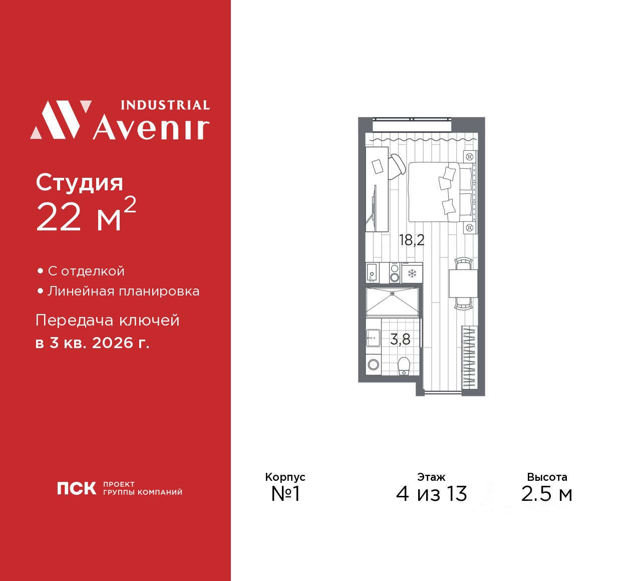 1-комн. апартаменты-студия от застройщика с отделкой в ЖК ''Industrial AVENIR'' на 4 этаже. Общая площадь: 22 кв.м., площадь гостиной 18.2 кв.м., из которых 5 кв.м. выделено под кухонную зону. Все окна выходят на одну сторону. В апартаментах один совмещенный санузел. Высота потолков 2.5 м.
