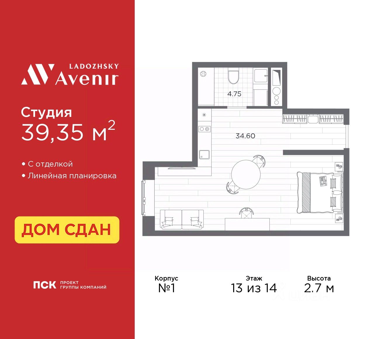 Однокомнатные апартаменты-студия с отделкой в ЖК ''Ladozhsky AVENIR'' на 13 этаже. Общая площадь: 39.35 кв.м., площадь гостиной 34.6 кв.м., из которых 5 кв.м. выделено под кухонную зону. Все окна выходят на одну сторону. В апартаментах один совмещенный санузел. Высота потолков 2.7 м.