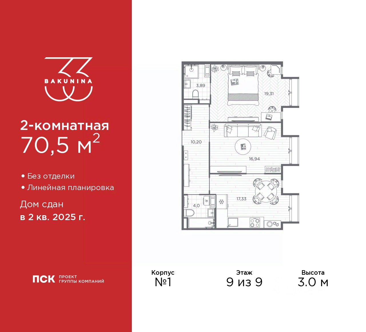Продается двухкомнатная квартира в ЖК ''BAKUNINA 33'' на 9 этаже. Квартира без отделки, после выдачи ключей можно делать ремонт. Общая площадь: 70.5 кв.м., жилая: 36.25 кв.м., площадь просторной кухни-столовой: 17.33 кв.м. Комнаты изолированные, все окна выходят на одну сторону. В квартире три балкона, два совмещенных санузла. Высота потолков 3.0 м.